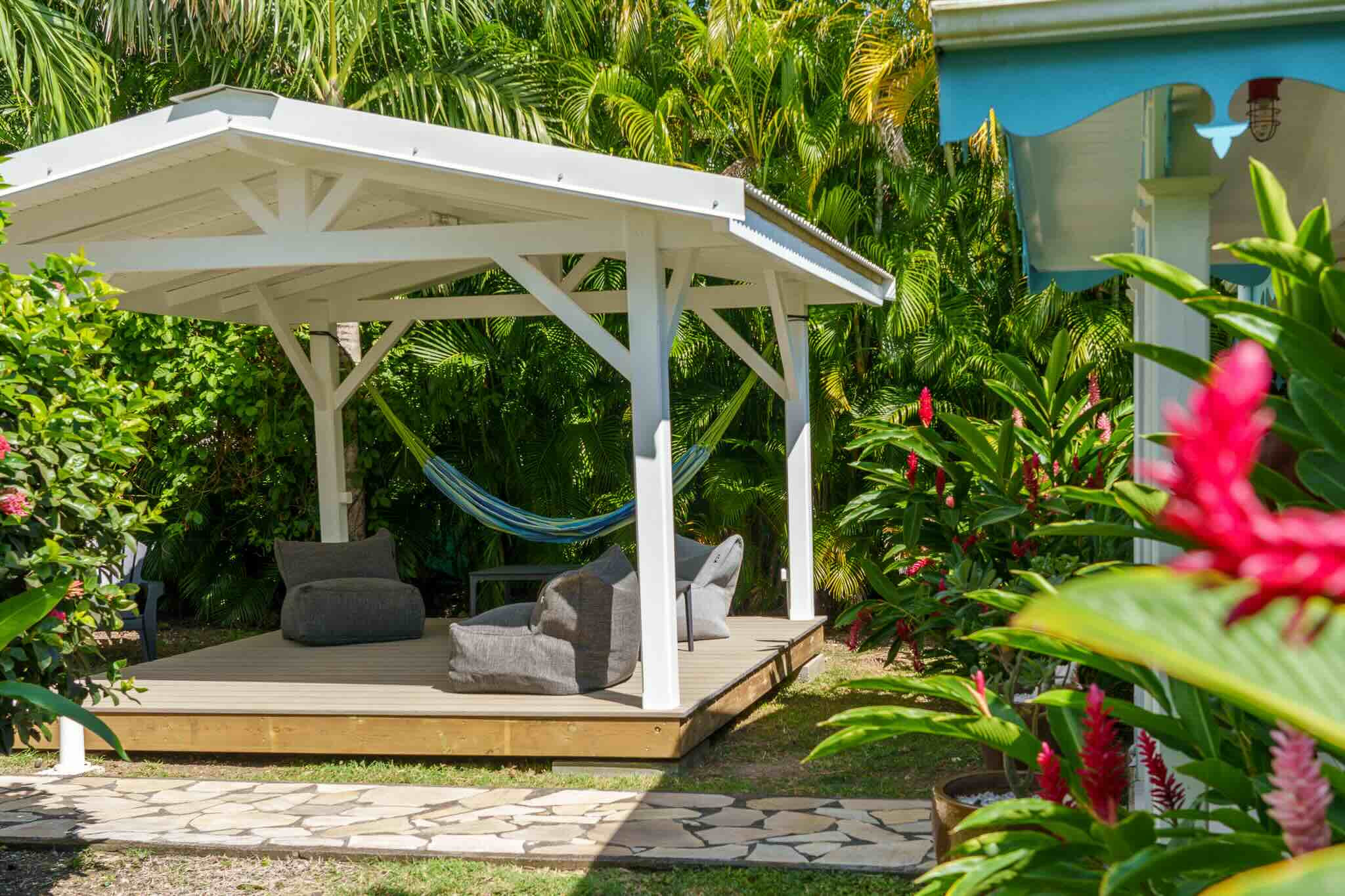 Nouvel espace dans le jardin tropical de la villa "Les Arbres Voyageurs" située à Saint-François en Guadeloupe.