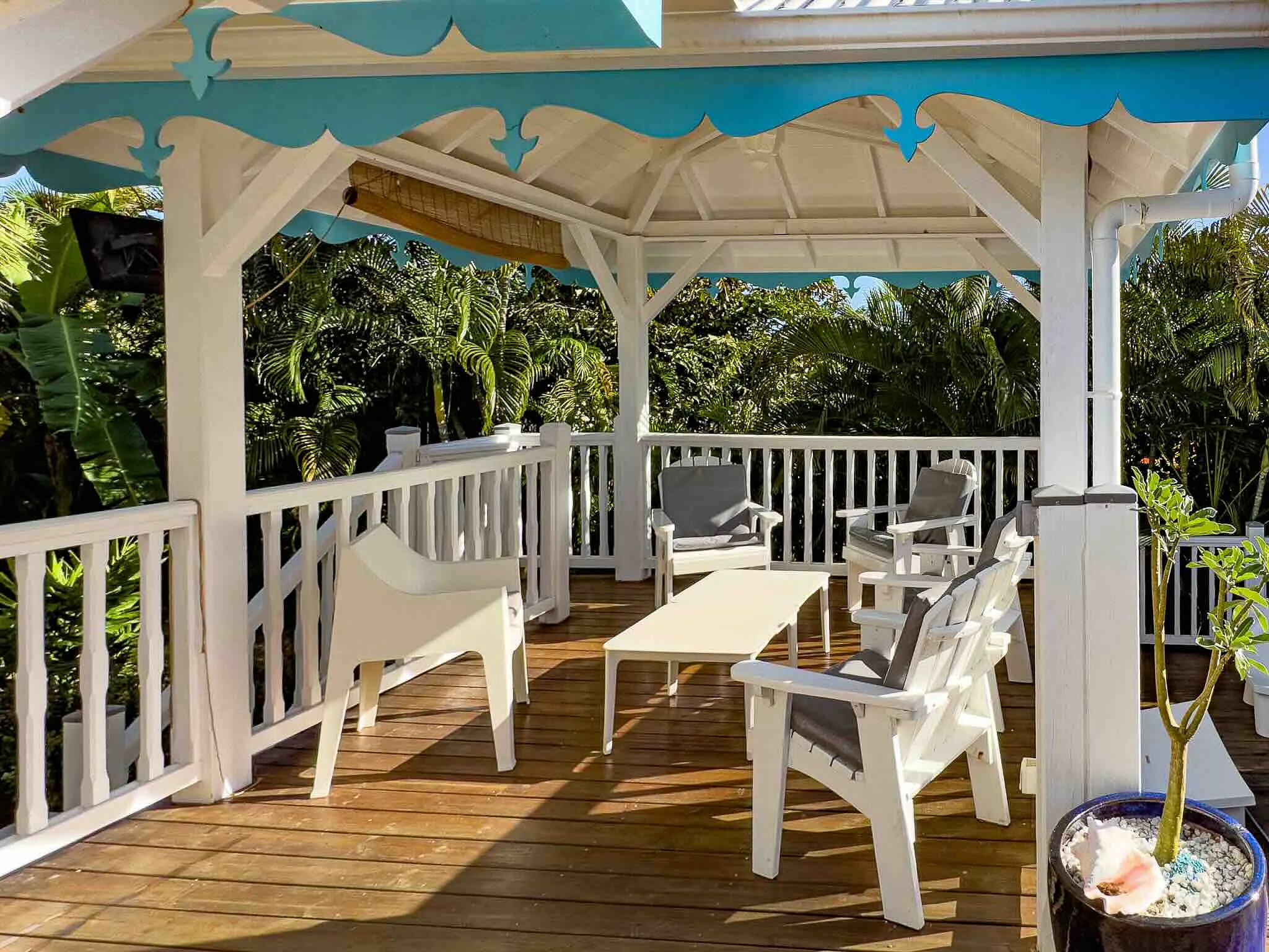 Grand carbet dans le jardin tropical avec un salon composé de fauteuils Roolf et hamac.