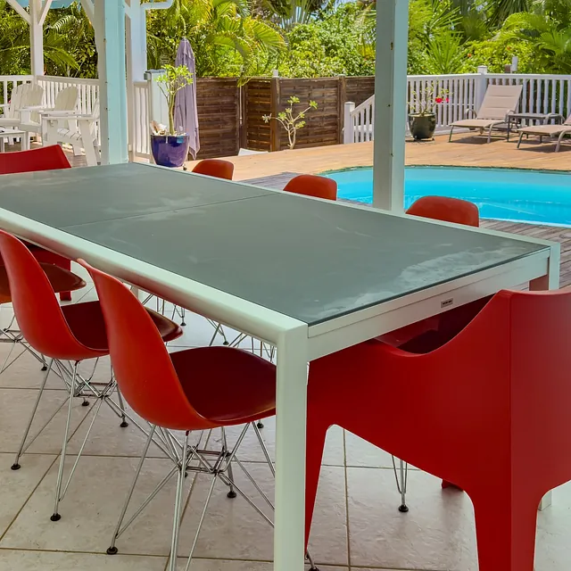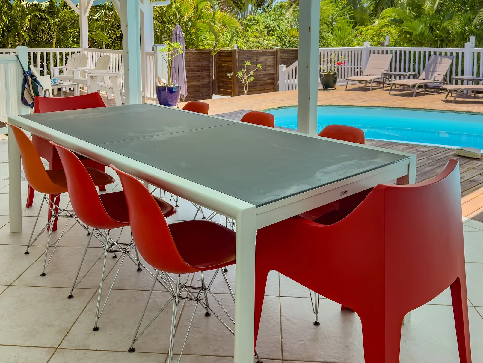 Lieu de vie par excellence et complétement équipée, la cuisine de la villa été conçue pour satisfaire vos goûts culinaires et vous permettre de faire de la cuisine guadeloupéenne.