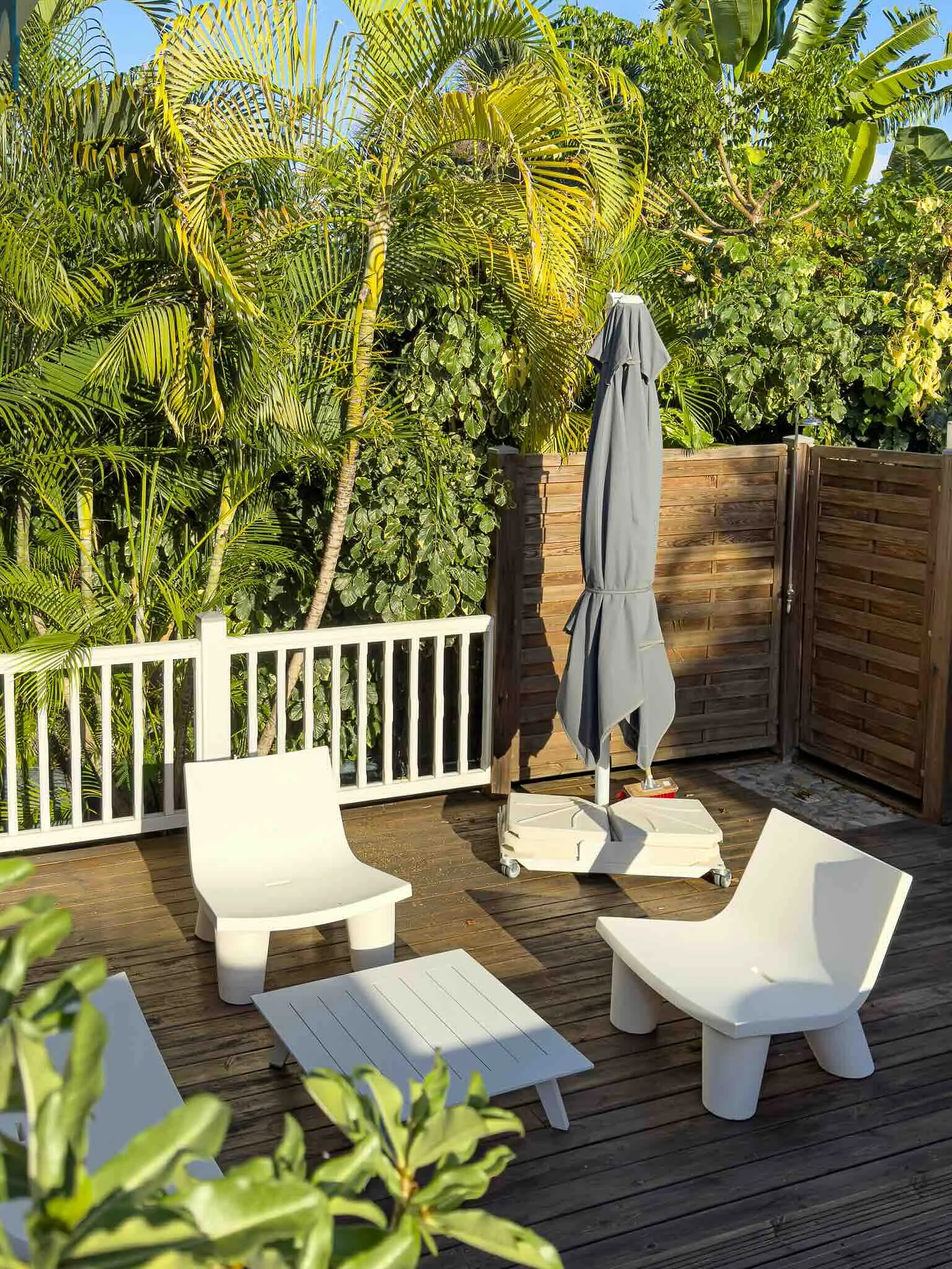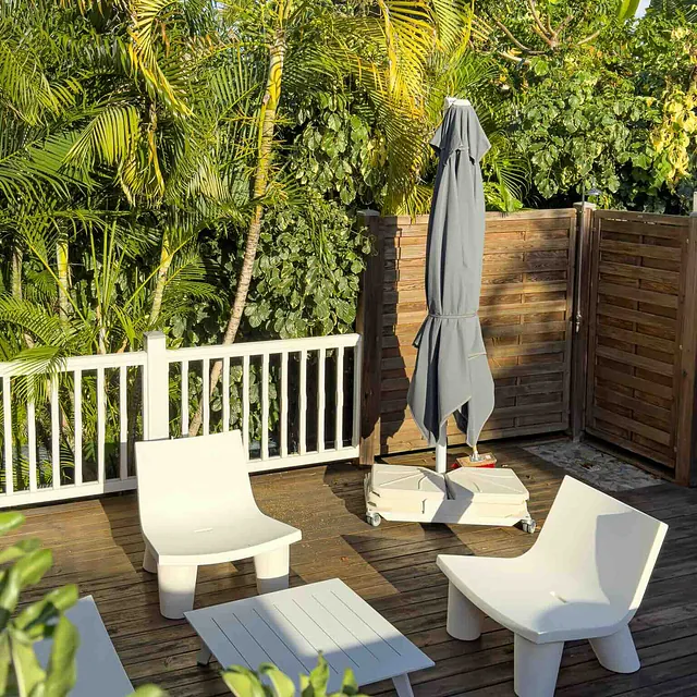 Parasol et stores pour se protéger du soleil en toute quiétude.