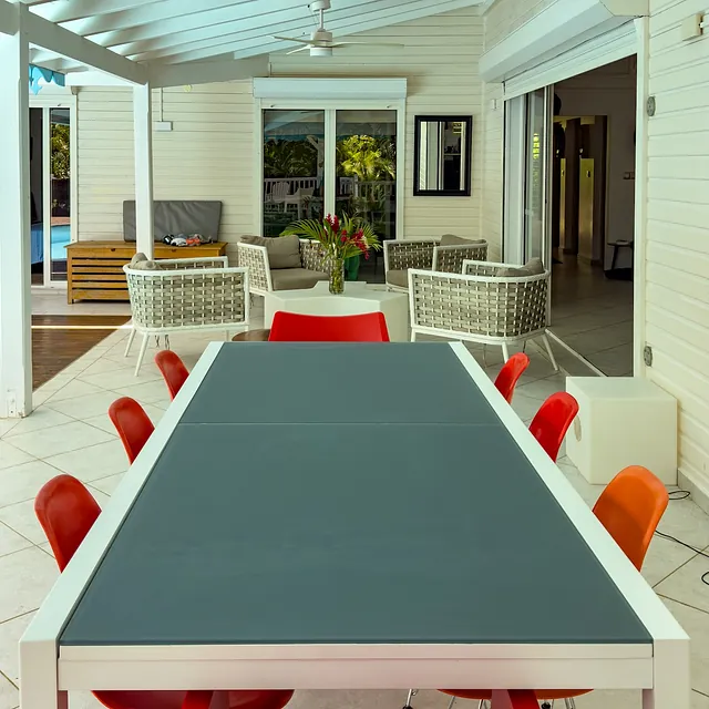 Une grande table de 8 /10 personnes pour partager les repas sur la terrasse abritée.